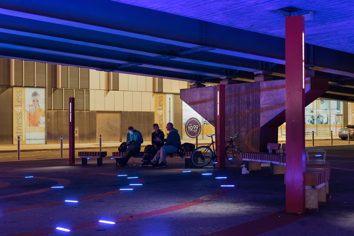 The A13 flyover was previously a very unwelcoming concrete pedestrian underpass which became a transformed public space under the A13 flyover as part of the Hallsville Quarter development.